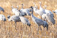 Kraanvogels (Grus Grus) aan het eten en aan het rusten in een veld bij Diepholz in Duitsland tijdens de herfsttrek