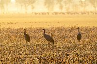Kraanvogels of Euraziatische kraanvogels (Grus Grus) die tijdens de herfsttrek op een veld bij Diepholz in Duitsland eten en uitrusten