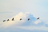 Kraanvogels of Euraziatische Kraanvogels (Grus Grus) vliegen in de lucht bij Diepholz in Duitsland tijdens de herfsttrek. Elk najaar verzamelen duizenden kraanvogels zich rond Diepholz, Duitsland, tijdens hun trek van Noord-Europa naar de zuidelijke overwinteringsgebieden. Ze rusten uit en voeden zich in de wetlands en velden in de regio, wat een spectaculair natuurlijk schouwspel oplevert. Hun geroep weerklinkt door het landschap terwijl ze zich voorbereiden op de lange reis naar het zuiden.