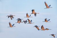 Kraanvogels of kraanvogels (Grus Grus) vliegen in de lucht tijdens een zonsondergang tijdens de herfsttrek over de heidevelden van Diepholz in Duitsland. De kraanvogels voeden en rusten in de velden rond de heidevelden in Nedersaksen, Duitsland tijdens hun trek van de broedgebieden in Noord-Duitsland, Polen en Scandinavië naar hun winterverblijf in Spanje en Noord-Afrika.