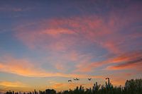 Kraanvogels vliegen over een bos bij zonsondergang. Dierenfoto van trekvogels.