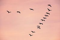 Kraanvogels of Europese of Euraziatische kraanvogel (Grus Grus) vliegen midden in de lucht tijdens de herfsttrek over de heidevelden van Diepholz in Duitsland. De kraanvogels voeden en rusten in de velden rond de heidevelden in Nedersaksen, Duitsland, tijdens hun trek van de broedgebieden in Noord-Duitsland, Polen en Scandinavië naar hun winterverblijf in Spanje en Noord-Afrika. De kraanvogel, ook bekend als de Euraziatische kraanvogel, is een grote vogel met een spanwijdte tot 2,4 meter. Tijdens de najaarstrek ziet men duizenden kraanvogels in V-vormige formaties door het luchtruim van Diepholz vliegen. De aanblik is vooral spectaculair tijdens een zonsondergang, wanneer de oranje en roze kleuren van de lucht een prachtig decor vormen voor de sierlijke vogels. Terwijl de kraanvogels overvliegen, weerklinkt hun kenmerkende bugelgeroep door het landschap. Deze roep wordt door de vogels gebruikt om met elkaar te communiceren en om in formatie te blijven terwijl ze zuidwaarts trekken naar hun overwinteringsgebieden. De kraanvogels staan bekend om hun indrukwekkende trektochten, die duizenden kilometers kunnen beslaan. Ze beginnen hun reis meestal eind augustus of begin september, en reizen via Diepholz op weg naar Spanje, Afrika of andere warmere streken.