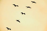 Kraanvogels (Grus Grus) vliegen midden in de lucht tijdens de herfsttrek over de heidevelden van Diepholz in Duitsland. De kraanvogels voeden en rusten in de velden rond de heidevelden in Nedersaksen, Duitsland, tijdens hun trek van de broedgebieden in Noord-Duitsland, Polen en Scandinavië naar hun winterverblijf in Spanje en Noord-Afrika.