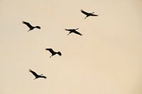 Kraanvogels (Grus Grus) vliegen in de lucht tijdens een zonsondergang tijdens de herfsttrek over de heidevelden van Diepholz in Duitsland. De kraanvogels voeden en rusten in de velden rond de heidevelden in Nedersaksen, Duitsland tijdens hun trek van de broedgebieden in Noord-Duitsland, Polen en Scandinavië naar hun winterverblijf in Spanje en Noord-Afrika.