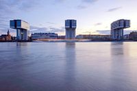 De kraanhuizen op de Rijn in Keulen in de schemering.