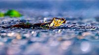 In deze macrofoto lijkt een krab een stuk zeewier op te tillen alsof het een gewicht is. Er spreekt kracht en vastberadenheid uit, bijna als een gewichtheffer op de dijk. De achtergrond met blauwe en paarse ondertonen versterkt de mysterieuze sfeer en benadrukt het verrassende en wonderlijke leven uit de zee.