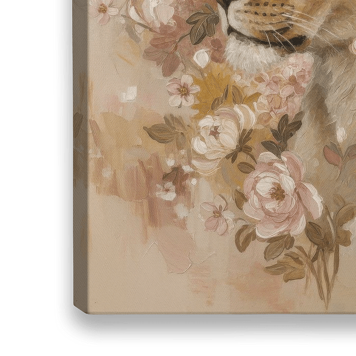 Ervaar de onweerstaanbare harmonie tussen kracht en elegantie in dit betoverende kunstwerk. Twee majestueuze leeuwen – een imposante mannetjesleeuw en een gracieuze leeuwin – worden omringd door een explosie van dromerige bloemen in zachte tinten. De combinatie van stoere dierlijke kracht met verfijnde bloesems creëert een beeld dat…