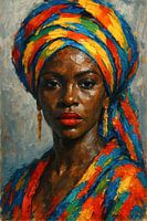 In stilte draagt ze haar kleuren als een verhaal. Elke strook in de kleding is een echo van voorouders, een fluistering van traditie, kracht en identiteit. Het portret vangt niet alleen haar gezicht, maar ook haar keuze: een bewuste omhulling in kleur, als bescherming, als statement, als ritueel. Mystiek en modern vloeien samen in deze ode aan inheemse trots en vrouwelijke kracht.