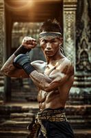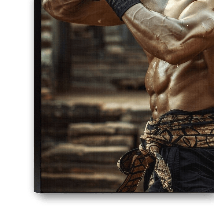De afbeelding toont een gespierde vechter in een indrukwekkende pose, die kracht en vastberadenheid uitstraalt. Zijn naakte torso en gedefinieerde spieren worden benadrukt door het licht, terwijl de kunstig vastgebonden riem en hoofdtooi culturele wortels suggereren. De antieke stenen achtergrond voegt dramatische diepte toe aan de scène.