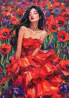 In de fauvistische stijl zien we een levendige en expressieve voorstelling van een vrouw met lang zwart haar, zittend in een rode jurk met ruches te midden van een veld vol felgekleurde, overdreven grote papavers. De kleuren zijn gedurfd en onnatuurlijk, waarbij de papavers opvallen in levendige rode, paarse en oranje tinten. De achtergrond is een explosie van kleur, opgebouwd uit krachtige penseelstreken die een wilde, emotionele energie uitstralen. De scène voelt intens en vol leven aan, zonder zich te bekommeren om realisme.