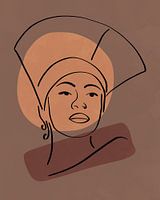 Minimalistische lijn tekening van een vrouwelijk gezicht met een hoed. De lijntekening van zwarte inkt is geplaatst op een achtergrond in bruin met twee organische vormen in licht en donker bruin.