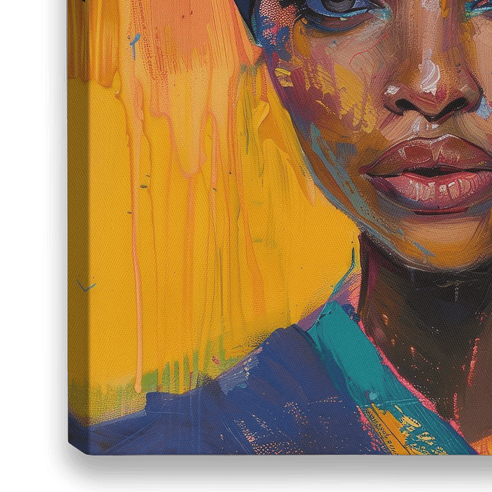 Dit expressieve portret toont de kracht en schoonheid van een Afrikaanse vrouw, weergegeven in een moderne en kleurrijke schilderstijl. De felle tinten geel, blauw en oranje vormen een dynamisch contrast, terwijl de hoofddoek en gouden oorbellen symbool staan voor culturele trots en elegantie.