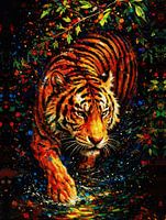 Intens olieverfschilderij dat een tijger's majestueuze aanwezigheid vastlegt terwijl hij door het water waadt, geaccentueerd door levendige kleurrijke spetters en donker gebladerte. De krachtige en energieke compositie maakt dit een heldhaftig middelpunt van wilde dieren voor moderne interieurs.
