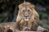 Mannetjes Leeuw (Panthera leo) liggend op een rots en kijkend naar de fotograaf, Nkomazi, Mpumalanga, Zuid-Afrika. © Henk Bogaard / Nature in Stock