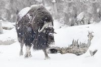 Krachtige gehoornde stier onder zware sneeuw in het bos. Ijsgehoornde poolreliëf van de ijstijd harig muskusosdier op wintersneeuw.