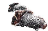 Koop de foto Krachtige harige muskusossen onder zware sneeuwval op een achtergrond van witte sneeuw. Twee muskuso van Michael Semenov als print op canvas, aluminium dibond, (ingelijste) fotoprint, behang en ArtFrame. Voor jou op maat geprint in Fine-Art kwaliteit.