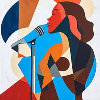Het motief van een zangeres ontvouwt zich in een fascinerend kleurenspel. Haar krachtige aanwezigheid wordt benadrukt door zachte rondingen en sterke contouren. De levendige blauwe en aardetinten strelen haar silhouet, terwijl de microfoon een brug vormt naar de muziek. Haar gesloten liefde voor de melodie straalt passie en toewijding…