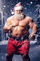 De kerstman als zeer gespierde sterke man geniet van de kerstsneeuw.