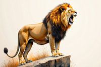 Mooie mannetjesleeuw met een open bek die zijn tanden laat zien staat op een rots en brult