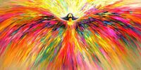 Dit krachtige abstracte kunstwerk straalt een dynamische energie uit, die de kijker onmiddellijk in beweging zet. De figuur in het midden, met uitgestrekte armen, lijkt te ontsnappen aan de statische ruimte om zich heen en straalt een intense kracht en vastberadenheid uit. De explosie van levendige kleuren zoals felroze, oranjerood,…