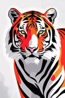 Deze prachtige digitale tijgerafbeelding straalt kracht en levendigheid uit met zijn levendige kleuren en gedetailleerde strepen. De oranje en rode tinten brengen het gezicht van de tijger tot leven, terwijl de zwart-witte accenten zijn wilde, majestueuze karakter versterken. Dit ontwerp voegt een modern, dynamisch tintje toe aan elke ruimte, of het nu een woonkamer of kantoor is. Het artwork past perfect bij een moderne inrichting en is een eyecatcher voor liefhebbers van wilde dieren en kunst. Het zou ook een prachtig cadeau zijn voor iemand die van eigentijdse kunst houdt.