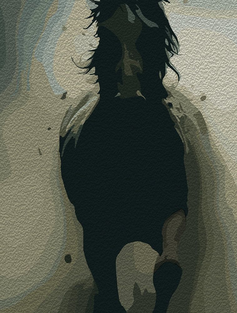 Een dynamisch silhouet van een zwarte hengst die door het stof raast en vrijheid en kracht symboliseert. Perfect voor paardenliefhebbers en fans van gedurfde, krachtige kunst.
