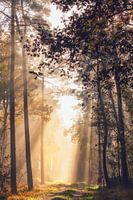 Een prachtig zonovergoten laan met dennenbomen diep in de Limburgse bossen van Lanaken. Een prachtig herfstmomentje in de vroege ochtend.