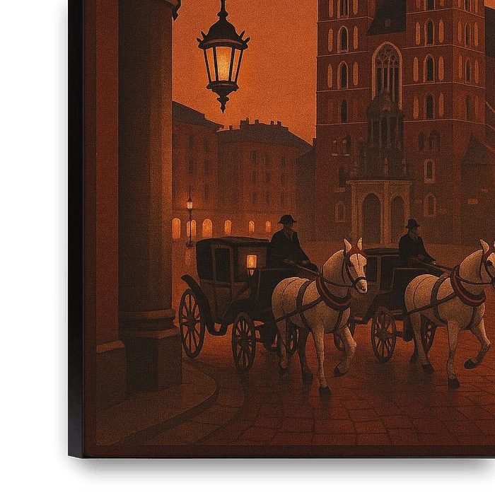 Stap in de magische sfeer van het grootste middeleeuwse stadsplein van Europa met deze sfeervolle illustratie van Krakau. Het kunstwerk legt de romantiek van de Grote Markt (Rynek Główny) bij schemering vast. De compositie wordt omlijst door de elegante bogen van de Lakenhal (Sukiennice), die uitkijken op de torenhoge, asymmetrische…