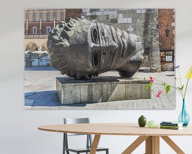 Die Bronzeskulptur The Head€œ. Der offizieller Titel lautet Eros Bendato (Eros Bound) und befindet sich auf dem Krakauer Hauptmarkt (Rynek Glowny). Es ist das Werk des polnischen Kuenstlers Igor Mitoraj (1944-2014), Krakau, Kleinpolen, Malopolskie, Polen, Europa