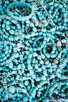 Bak vol met turquoise kralen armbandjes bij een Griekse souvenirwinkel