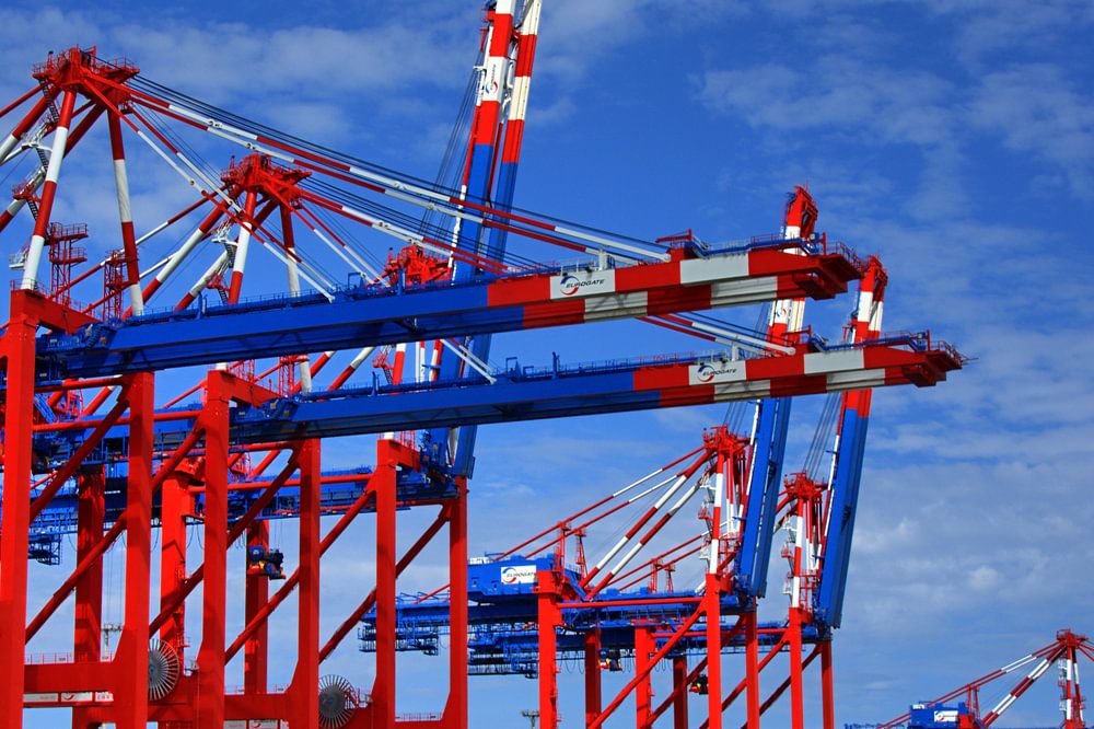 Havenkranen en containerschip in de Jade Weser Haven bij Wilhelmshaven aan de Jadebaai.
