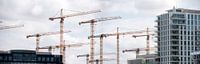 Hamburg Germany Urban regeneration. Building site work and cranes in the HafenCity district. Liebherr cranes forming geometric pattern on the skyline. Panorama view.