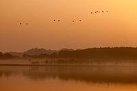 Kranen in de vroege ochtend bij zonsopgang over de Rederanger See in Mecklenburg-Vorpommern.