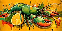 Een kleurrijke en gestileerde afbeelding van een kreeft tegen een spetterende achtergrond.