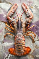 Een modern stilleven met een kreeft op een marmeren plaat. Abstract en artistiek.