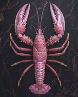 Prachtige grote roze kreeft versierd van bovenaf gezien op een donkere achtergrond waardoor de kreeft er qua kleur uitspringt. Dit werk past perfect in een keuken of woonkamer van fijnproevers.