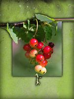 De afbeelding toont een bessentak met een enkele druif en een aquarel achtergrond als een digitale collage op structuurkarton van Dirk H. Wendt.
