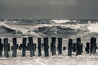 Op het Noordzeestrand rollen de golven naar de kust. Op de voorgrond zijn houten strandhoofden te zien. Een stormachtige dag in Nederland. Een prachtige monochrome foto.