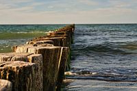 Kribben die in de Oostzee reiken in Zingst. Lichtgolven in de zon.