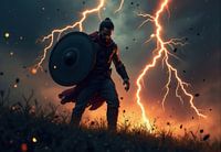 Een gespierde man in oude krijgskleding staat midden in een stormachtig landschap en houdt een groot rond schild vast. Bliksemflitsen achter hem verlichten de scène in dramatische oranje en donkere tinten. De algehele sfeer is intens en krachtig.