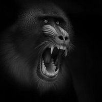 Een krijsende mandril laat zijn tanden zien in zwart wit