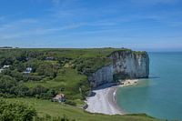 Krijtrotsen bij Vaucottes in Normandië, Frankrijk. De lucht aan de Cote d'Albatre is prachtig blauw, het gras en de bomen zijn schitterend groen, kortom een idyllisch plaatje.