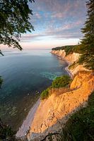 De krijtrots in het Nationaal Park Jasmund op het eiland Rügen aan de Oostzee in Mecklenburg Vorpommern. De foto toont een van de mooiste delen van de krijtkust, die bij zonsopgang wit gloeit. De prachtige beukenbossen daar maken deel uit van het wereldnatuurerfgoed.