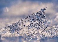 Een mooi winter stukje ijs. Een uniek macro-weergave van een klein koud stilleven. Kristallen hebben zich gevormd tot een geraffineerd fijnzinnig filigrain-werkje.... (Filigraan). IJsblauw, wit en een prachtig bokeh in de achtergrond. Letterlijk; een prachtige 'coole' heel fijnzinnige muurdecoratie!