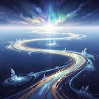 Een etherische, levendige scène met een kronkelende rivier door blauw water, kristallen en een kleurrijke, stralende lucht.