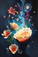 Een magisch tafereel waarin natuur en kosmos samensmelten in een betoverende dans van licht en kleur. Stralende bloemen in zachte oranje tinten ontspruiten uit een schelpachtige kelk, terwijl kristallen, sterren en planeten gracieus worden meegevoerd door een helderblauwe stroom. Een delicate vlinder zweeft door de compositie en voegt een vleugje leven, fragiliteit en dynamiek toe aan dit mystieke landschap.