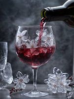 De hand van de schenker, nauwelijks zichtbaar maar elegant in zijn beweging, voegt een dynamisch element toe aan de compositie. De wijn stroomt soepel en vloeiend, alsof het leven en kleur geeft aan de bloesems binnenin het glas. De grijze, mistige achtergrond versterkt dit gevoel van magie en mysterie, waardoor de scène een etherische kwaliteit krijgt.