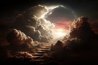 Dit indrukwekkende beeld toont een reeks kristallen treden die door een dramatisch wolkenlandschap kronkelen en naar een hemels portaal leiden. De hele scène wordt overspoeld met een warm, gouden licht dat afkomstig is van de zonsondergang en een mystieke, bijna heilige sfeer creëert. De kristalheldere treden symboliseren zuiverheid, helderheid en de spirituele reis omhoog - een metafoor voor opstijgen, transformatie en verlichting. De dramatische wolken contrasteren met het gloeiende portaal aan de horizon, waardoor de scène een diepe emotionele impact heeft. Dit motief is ideaal voor spirituele, esoterische of meditatieve thema's en kan ook worden gebruikt als visuele inspiratie voor fantasieprojecten, droomwerelden of conceptuele kunstwerken. Het appelleert aan de behoefte aan innerlijke ontwikkeling, hoop en het streven naar een hogere dimensie - zij het in persoonlijke, spirituele of artistieke zin.