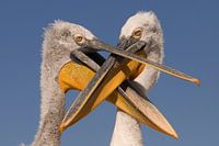 Kroeskoppelikanen met hun koppen bij elkaar.