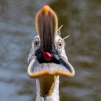 Een Kroeskoppelikaan was aan het spelen met een besje. Toen ik er ook een plukte en hem toe gooide kon ik nog net deze foto maken.
